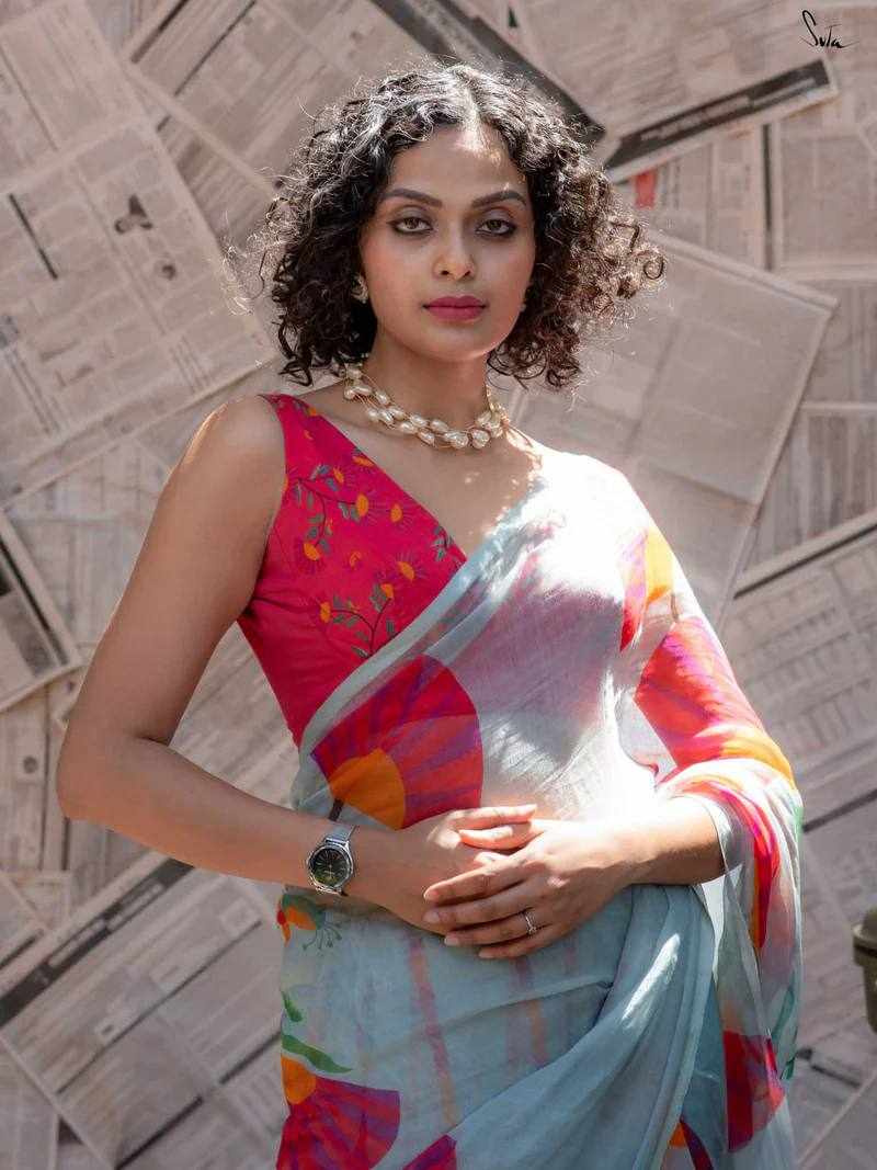 Saree Fabric: Premium Linen Cotton with beautiful digital print and elegant handmade cotton tassels