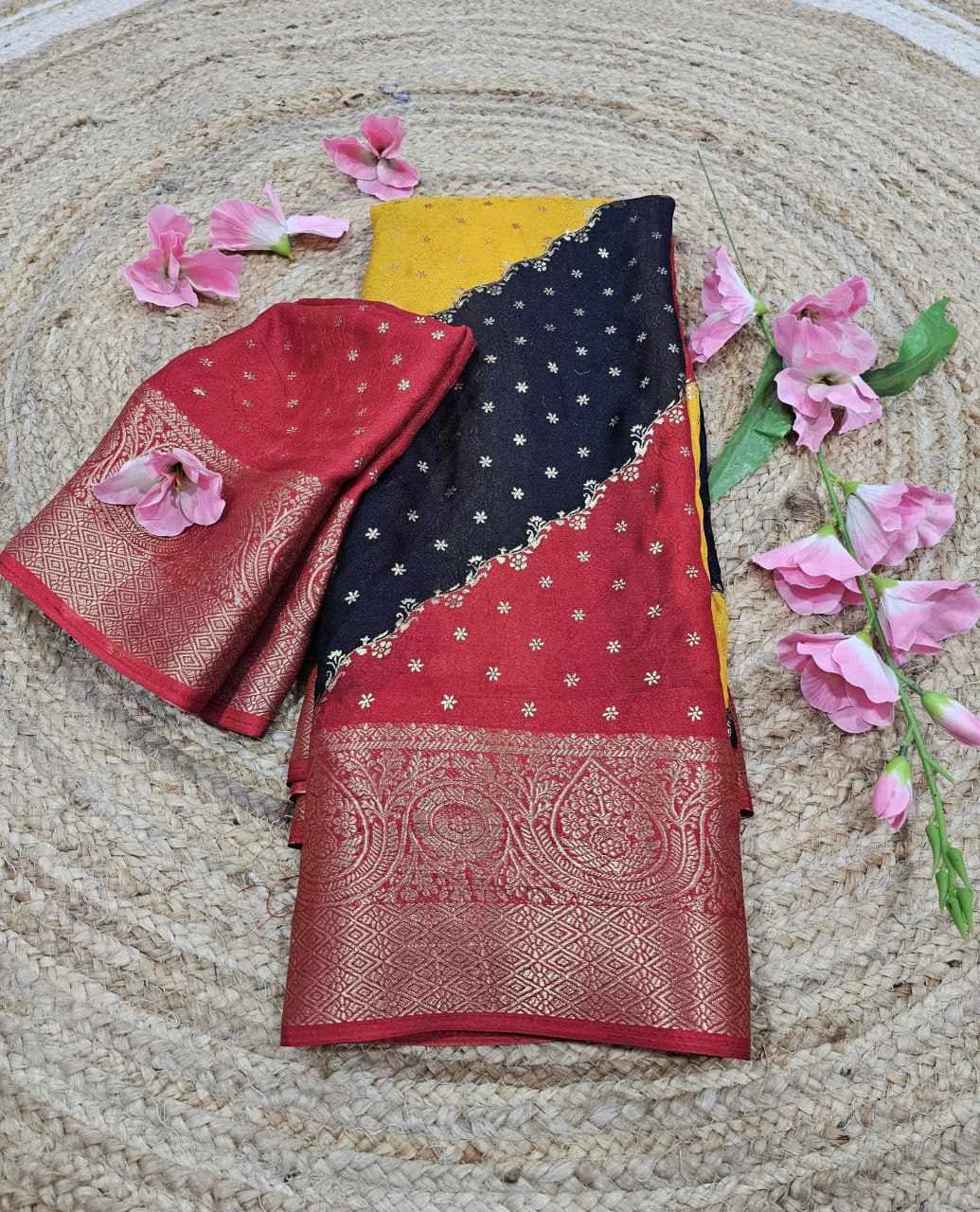 Saree Fabric :march mellow jecard border with foil printed sarees design